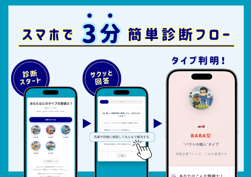 谷区、代表取締役:井田秀明)は、10問ウェブ回答で自分の傾向がわかる「整備士タイプ診