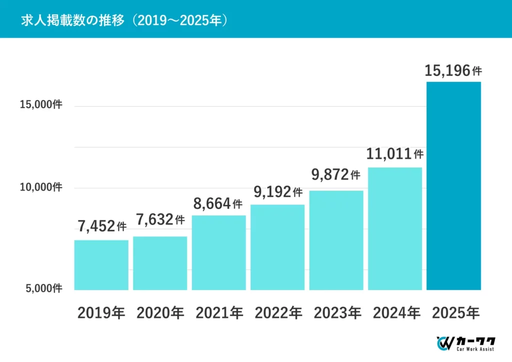 『カーワク』は、2025年下半期(7月〜12月)において、月平均約1.5万件の求人を掲載しました。これを一般的な掲載課金型求人サイトの費用相場に換算すると、半年間で約31億円以上に相当し、完全無料の『カーワク』はその採用費削減に貢献したことになります。