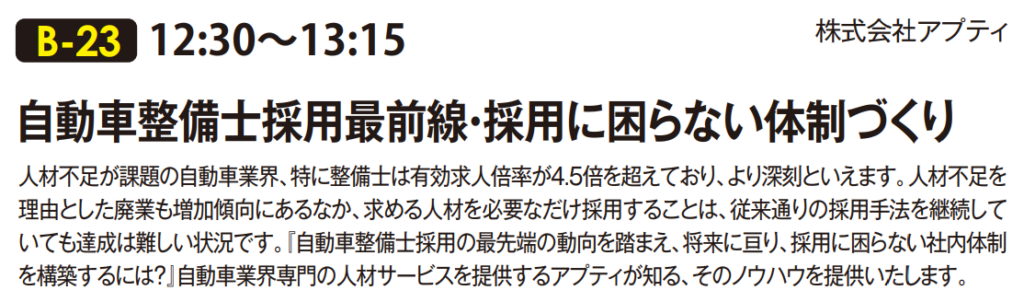 また、11月12日(日)12:30より、当社人材事業部長による自動車整備士採用に関するセミナー「自動車整備士採用前線・採用に困らない体制づくり」を開催予定です。