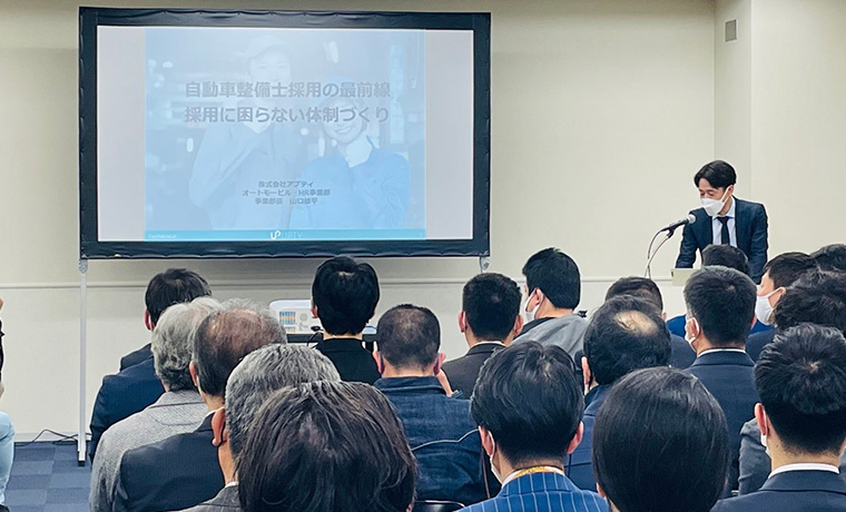 講演は「自動車整備士採用の最前線・採用に困らない体制づくり」と題し、自動車業界全体の課題である整備士採用に対して、最新の情報を踏まえた上で、どうすれば採用に困らないかについて、弊社の持つノウハウや蓄積してきた知見を元に、具体的に何をすれば良いのかを説明いたしました。