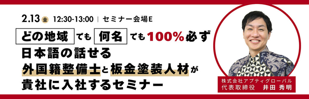自動車業界専門の転職求人サイト『カーワク』( https://carworkassist.com/ )を運営する株式会社アプティ(本社:東京都渋谷区、代表取締役:井田秀明)は、東京ビッグサイトで2026年2月12日(木)~14日(土)に開催される「第23回 国際オートアフターマーケットEXPO 2026」に出展します。会場では、当社代表による無料セミナー「どの地域でも、何名でも、100%必ず日本語の話せる外国籍整備士と板金塗装人材が貴社に入社するセミナー」も開催します。