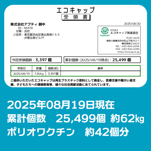 キャップ600個で約20円となり、ポリオワクチン一人分の支援となりますため、約42人分の支援を行うことが出来ました。